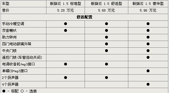 新旗云1.5L在舒適配置上,舒適型和豪華型配置了助力轉(zhuǎn)向、電動門窗、冷暖空調(diào)等,豪華型標(biāo)配了遙控門鎖、單碟CD等豪華配置。