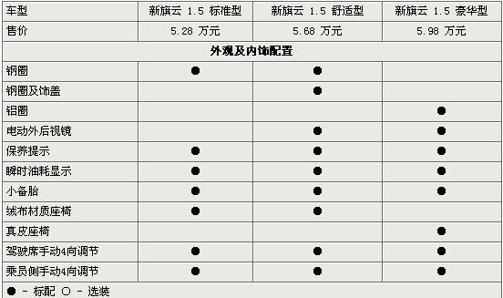 在外觀內(nèi)飾配置方面,新旗云1.5L全車標(biāo)配了保養(yǎng)提示和瞬時油耗顯示兩個實用配置,豪華型配置了鋁圈、真皮座椅、電動后視鏡等,同時駕駛席及乘員席座椅都為手動4向調(diào)節(jié)。