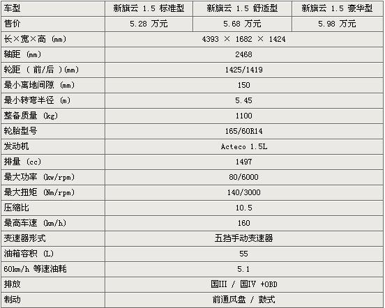 7月1日,奇瑞新旗云1.5L正式上市,推出標(biāo)準(zhǔn)型、舒適型、豪華型三個系列車型,售價5.28-5.98萬元,旗云1.6L車型已經(jīng)不再銷售。目前,新旗云1.5L已經(jīng)到店銷售,下面為這款車的詳細(xì)參數(shù)配置,見下表: