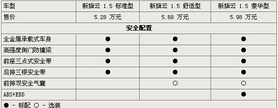 在安全配置方面,只有豪華型配置了ABS+EBD,其他如承載式車身、車門防撞梁、三點安全帶等都是基本安全配置,而安全氣囊則是選裝配置,這有點吝嗇了。