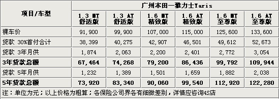 對(duì)于希望貸款購(gòu)車(chē)的朋友來(lái)說(shuō),目前豐田雅力士的貸款購(gòu)車(chē)也可以正常進(jìn)行。豐田汽車(chē)擁有自己的直屬金融機(jī)構(gòu),可以幫助消費(fèi)者更快捷的辦理貸款業(yè)務(wù)。以裸車(chē)價(jià)(已含購(gòu)置稅)9.19萬(wàn)的舒適版雅力士為例,您最高可以享受到70%、3年的按揭(公務(wù)員、教師可達(dá)5年),這樣的話(huà)購(gòu)買(mǎi)該車(chē)的首付金額總計(jì)大致在3.8萬(wàn)元上下,3年月還1874元、5年月還1232元。對(duì)于一般收入在6-8千元上下的家庭來(lái)說(shuō)還是比較容易承擔(dān)的。3年一共要還款6.7萬(wàn)元左右,5年貸款則要還款7.4萬(wàn)元左右。