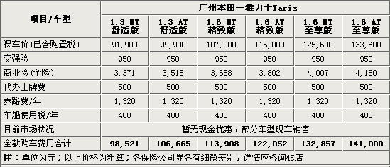 2008年6月26日,廣州豐田的首款經(jīng)濟(jì)型轎車(chē)正式上市,首批上市的共有1.3L、1.6L兩種排量9款車(chē)型,廠(chǎng)家指導(dǎo)價(jià)從9.19萬(wàn)元至13.36萬(wàn)元不等。與其它汽車(chē)廠(chǎng)商不同的是,雅力士公布的廠(chǎng)商指導(dǎo)價(jià)包含了其自身的車(chē)輛購(gòu)置稅。那么對(duì)于想要購(gòu)買(mǎi)該車(chē)的朋友來(lái)說(shuō),將這部豐田雅力士開(kāi)到家以后的總計(jì)花費(fèi)要達(dá)到多少元呢?提車(chē)時(shí)又該注意些什么呢?下面我們就來(lái)一起了解一下吧!