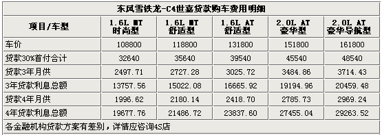 由于東風(fēng)雪鐵龍目前還沒有自己的金融公司,所以希望貸款購車的朋友需要到各大銀行辦理。以C4世嘉1.6手動(dòng)時(shí)尚型為例,售價(jià)10.88萬元,您最高可以享受到70%、3年或4年的按揭,這樣的話購買該車的首付金額總計(jì)大致在3.2萬元上下,3年月還2497元左右、4年月還1996元左右。對于一般收入在6-8千元上下的家庭來說還是能夠承擔(dān)的。但是3年按揭您要多還給銀行13757元貸款利息,4年則多還19677元,一年相差了近6000元。