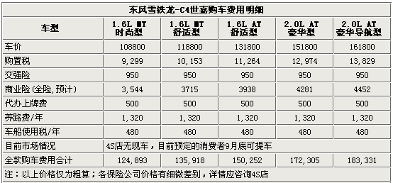 東風(fēng)雪鐵龍于2008年7月28日公布了今年第二款新車C4世嘉的廠商指導(dǎo)價(jià),售價(jià)為10.88萬-16.18萬元。雖然這款新車9月才會正式上市銷售,但是C4世嘉憑借全新的外觀設(shè)計(jì)和豐富的配置,得到了眾多消費(fèi)者的關(guān)注。那么對于想要購買該車的朋友來說,將東風(fēng)雪鐵龍C4世嘉開回家的總計(jì)花費(fèi)要達(dá)到多少元呢?提車時(shí)又該注意些什么呢?下面我們就來一起了解一下吧。