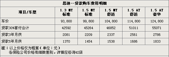 對于希望貸款購車的朋友來說,目前本田思迪(參數(shù)配置 圖庫)的貸款購車可以正常進(jìn)行。不過本田目前還沒有自己的金融公司,所以貸款業(yè)務(wù)還是與各大銀行辦理的。以售價9.38萬元的思迪1.3L手動擋車型為例,您最高可以享受到70%、3年的按揭(公務(wù)員、教師可達(dá)5年),這樣的話購買該車的首付金額總計大致在4.3萬元上下,3年月還2081元左右、5年月還1370元左右。