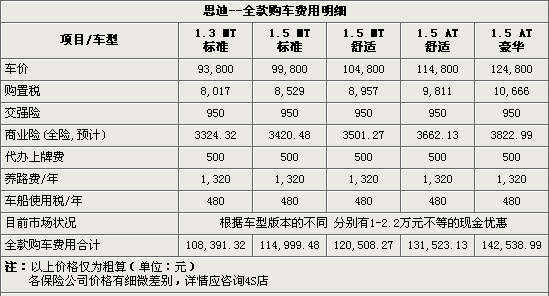 隨著廣州本田全新思迪(參數(shù)配置 圖庫)上市日期的日益臨近,現(xiàn)行在售的老款思迪的售價也相應(yīng)的出現(xiàn)了浮動。這樣一來,指導(dǎo)價格為9.38萬元至12.482萬元的現(xiàn)款思迪在出現(xiàn)過萬的現(xiàn)金優(yōu)惠后,其性價比的提升進(jìn)而吸引了眾多準(zhǔn)備購買經(jīng)濟(jì)型家庭用車的消費者們。那么,對于想要購買思迪的朋友來說,將這部本田思迪開到家以后的總計花費要達(dá)到多少元呢?提車時又該注意些什么呢?下面我們就來一起了解一下吧!
