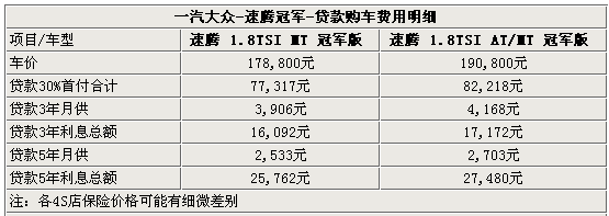 從購車的角度來講,現(xiàn)在主要可以分為全款購車以及貸款購車兩種。我們也將從這兩方面展開介紹。面對一款全新的車型,商家往往是不會給出任何優(yōu)惠的。那么在面對高昂的售價時,很多人會選擇貸款購車這一方式,那么速騰冠軍版的貸款是怎么樣的呢?具體情況如上圖所示,可分為3年期以及5年期兩類。5年期主要是針對國家公務員的項目,而3年期才是針對一般消費者的。下面就讓我來了解一下,三年期的實際情況。從上表我們可以看出,目前冠軍版速騰最便宜的車型,首付金額不到8萬元,而月還款金額在3906元。而五年期的月還款要明顯低于三年期的為2533元。但在貸款利息方面,五年期利息總額的要比三年期的高出了近一萬元。