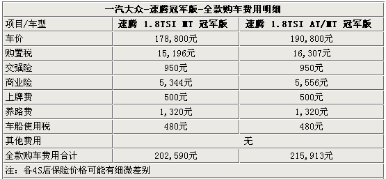 今天,萬眾矚目的第29屆奧運會就將在北京舉行了。而作為本屆奧運會唯一的車輛供應廠商,大眾汽車也不失時機的推出了旗下熱銷車型速騰(參數(shù)配置 圖庫)的冠軍版車型。全新的速騰冠軍版,共有手動及自動兩款供消費者選擇,售價分別為17.88萬以及19.08萬元。那么如果現(xiàn)在想把冠軍迎回家,需要花多少錢呢?下面就讓我們通過這本指南來一探究竟。