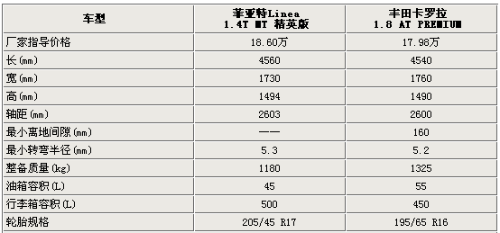 兩款車同為三廂A級(jí)轎車,菲亞特linea在車身長(zhǎng)度和高度略占上風(fēng),但卡羅拉的車寬更具優(yōu)勢(shì)。菲亞特linea和卡羅拉的軸距均在2600mm左右,可以預(yù)計(jì)這兩款車在車內(nèi)腿部空間方面不相上下。菲亞特linea的油箱容積要小于卡羅拉,但對(duì)于經(jīng)濟(jì)型轎車來說足以滿足人們?nèi)粘9ぷ骱投掏韭糜蔚男枨蟆?/P>