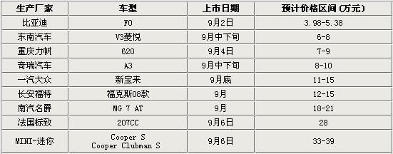縱觀8月份盡管有數款新車登陸國內車市,但是這些新車在8月的主旋律“奧運”的大背景下多少都有些相形見絀。于是一些精明的廠家也估計的避開“奧運高峰”選擇9月份去發(fā)表自己的全新車型。根據記者統(tǒng)計,9月份中至少有7款國產車型和2兩款進口車型宣布上市,為08車市的“秋收”開一個頭。