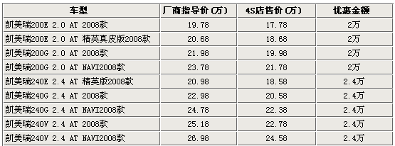 隨著新款車型上市時(shí)間的日益臨近,目前銷售的08款凱美瑞價(jià)格出現(xiàn)了松動。據(jù)網(wǎng)上車市價(jià)格監(jiān)測系統(tǒng)顯示,目前在許多地區(qū)的廣汽豐田4S店購買08款凱美瑞系列車型,最高可以享受到2.4萬元的現(xiàn)金優(yōu)惠。