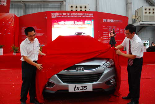 與昆山華騰汽車貿(mào)易服務(wù)有限公司副總經(jīng)理張馳為北京現(xiàn)代iX35揭幕。