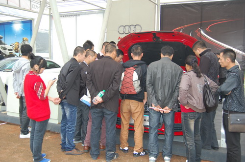 連續(xù)的廣告轟炸讓我不得不開始關注這個西部名城汽車巡展了。到底是什么車展搞的這么有氣勢呢?“二十余品牌,百款靚車,千元優(yōu)惠券,百萬讓利”。10月16日,車展的第一天,我?guī)е@份好奇來到了樂山市體育中心,大紅條幅高高掛,“2010第二屆西部名城汽車巡展樂山站歡迎您”。走進展場第一眼看到的就是奧迪的展位。A4L、A5兩款靚車被人群緊緊包圍。別看樂山只是個二級城市,開奧迪的人可不少,咱樂山人有錢。