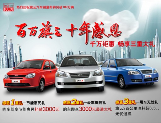 感恩的心,感謝有你。以“美好生活創(chuàng)造者”為品牌理念的旗云,立志成為消費(fèi)者事業(yè)和生活的好伙伴,為消費(fèi)者創(chuàng)造美好生活。十年的發(fā)展為旗云帶來(lái)了優(yōu)良的口碑,百萬(wàn)車(chē)主的信賴(lài),讓旗云品牌深感驕傲和自豪,也成為旗云品牌前進(jìn)的動(dòng)力。旗云十年的發(fā)展,離不開(kāi)消費(fèi)者的支持和信賴(lài)。在銷(xiāo)量即將突破100萬(wàn)輛的美好時(shí)刻,旗云品牌以這樣的方式真誠(chéng)回饋消費(fèi)者,希望能為更多的消費(fèi)者創(chuàng)造美好生活,感謝您和旗云一路美好相伴。