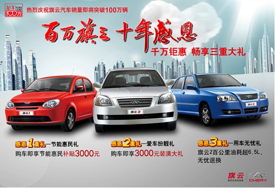 十年風(fēng)華,十年成長。進(jìn)入第十個(gè)年頭的奇瑞旗云品牌,銷量即將突破100萬輛。奔向百萬輛時(shí)代的旗云,品牌形象全面升級,銷量不斷上揚(yáng),在自主家轎品牌中的領(lǐng)跑地位進(jìn)一步鞏固;厥资陙淼臍v程,旗云品牌充滿感恩。正是因?yàn)橄M(fèi)者十年來對旗云一貫的支持和厚愛,才促使旗云取得了十年百萬輛的輝煌成就。因此,在銷量即將破百萬之際,旗云品牌推出“感恩三重禮”,最高優(yōu)惠6000元,以千萬鉅惠回饋消費(fèi)者對旗云品牌的厚愛。