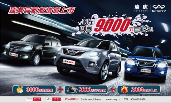 據(jù)奇瑞經(jīng)銷商介紹,本次新推出的瑞虎導航版是在瑞虎經(jīng)典版的基礎(chǔ)上加裝包括具有DVD影音系統(tǒng)、GPS導航、倒車影像系統(tǒng)等功能的DVD智能導航裝備。即日起,凡購買瑞虎經(jīng)典版均可享受包括3000元現(xiàn)金、3000元DVD導航、3000元禮包,共計9000元的三重大禮優(yōu)惠。