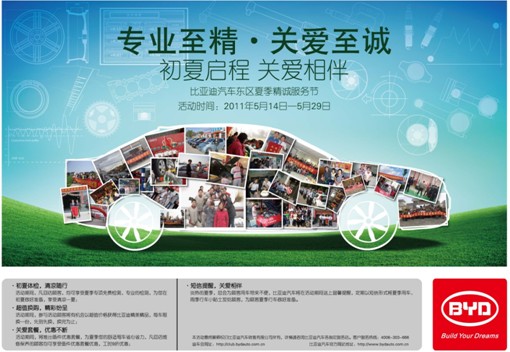 目前,筆者從比亞迪4S店工作人員處得知,2011年5月14日—29日,比亞迪汽車在東部銷售區(qū)推出了“專業(yè)至精 關(guān)愛至誠”夏季精誠服務(wù)節(jié)活動。活動期間,凡回店顧客均可享受夏季專項免費檢測,并有機會以超值價格獲得比亞迪精美精品等(更多驚喜請到店咨詢)。相信在高智能配置的基礎(chǔ)上,配合貼心的售后服務(wù),G3一定能俘獲更多潛在車主們的芳心,其市場銷量仍有望繼續(xù)攀高!