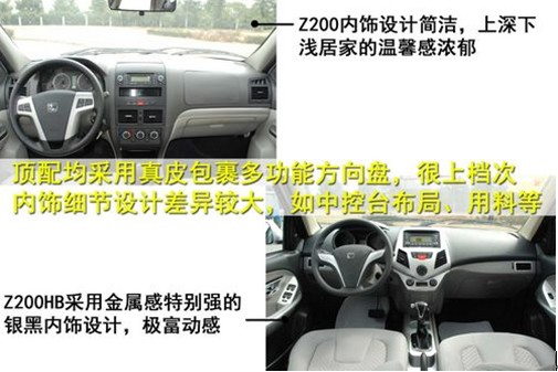 除去外型上的差異,Z200和Z200HB在內(nèi)飾設(shè)計中差異化也極為明顯。Z200內(nèi)飾氛圍設(shè)計內(nèi)飾簡約實用,工藝精致細膩,上深下淺的顏色搭配所帶來的溫馨感也非常符合家用車的特點。Z200HB的內(nèi)飾大量的采用了銀灰色的鍍鉻裝飾,金屬質(zhì)感十足,尤其是盾形中控臺極富力量性,加行三角形的多功能方向盤,那種讓人血脈噴張的運動侵略性哄然而出。