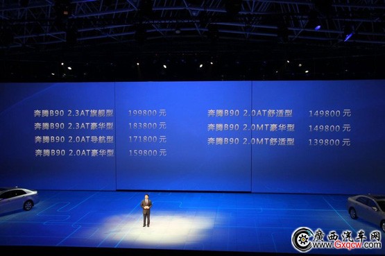 2012年8月22日,以“領(lǐng)科技 共進取”為主題的奔騰B90上市發(fā)布會在北京國貿(mào)國際會展中心新館 8號館成功舉行,宣告了奔騰品牌全新中高級旗艦奔騰B90的正式上市。新車推出2.0L、2.3L兩款排量共7款車型,一汽轎車銷售有限公司總經(jīng)理張曉軍公布了奔騰B90的售價區(qū)間:13.98萬-19.98萬元。具體車型售價如下: