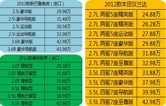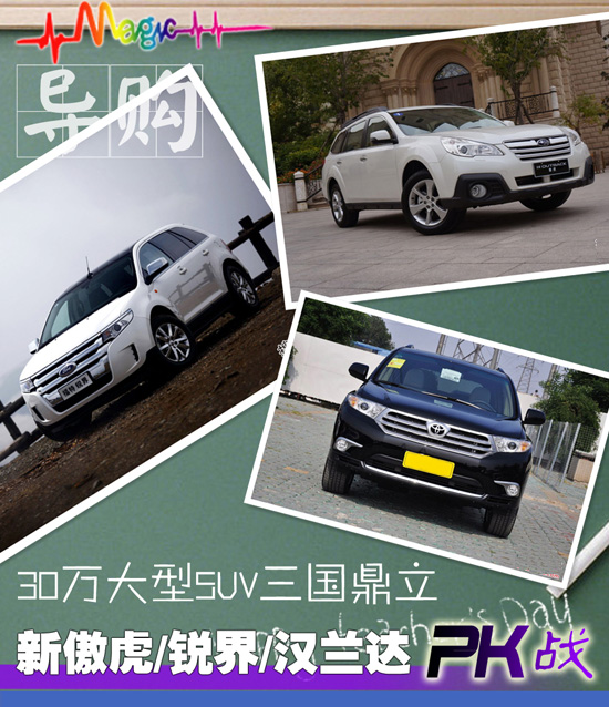 時間流逝金九銀十,斯巴魯帶著全新2013款傲虎走入了我們的視野:第三代水平對置發(fā)動機、不俗的空間尺寸、進口的身份和30萬元的主流價位,野心不言而喻,直接對手直指豐田漢蘭達和福特2.0T銳界,三款車型無論尺寸、做工以及售價都極為相近,原本兩虎相爭的局面,隨著新傲虎的強勢來襲,30萬大型SUV市場步入三足鼎立的白熱化環(huán)節(jié),對于想買一款尺寸、空間、配置都在B級車水準之上的中大型SUV的人來說,漢蘭達已不再孤獨。汽車市場上激戰(zhàn)火熱,我們也不能無動于衷,筆者以3款車型的30萬元價位配置為基準,舉辦一場中大型30萬元SUV PK戰(zhàn),希望我們的導購文章能為你們的購車帶來寶貴的參考價值和購買意向。