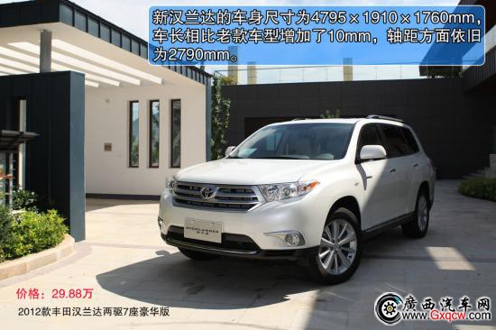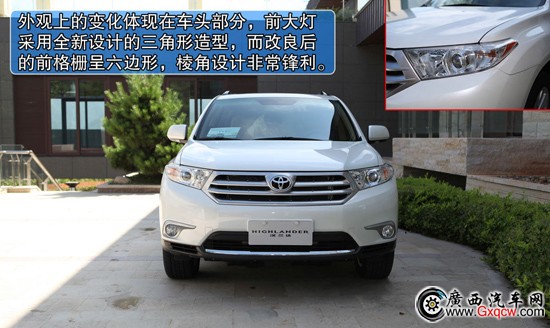 2012款豐田漢蘭達2.7L兩驅(qū)7座豪華版——外觀:從2012款變化主要體現(xiàn)在車頭部分,前大燈采用全新設(shè)計的三角形造型,并且融入了透鏡,顯得更加銳利有神,同時投射出的燈光也更加均勻,遺憾的是目前全系車型都沒有裝配氙氣大燈。而改良后的前格柵呈六邊形,棱角設(shè)計非常鋒利,表面采用了啞光鍍鉻設(shè)計,更顯豪華感。