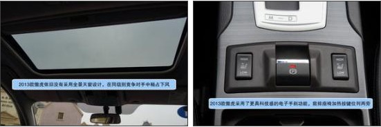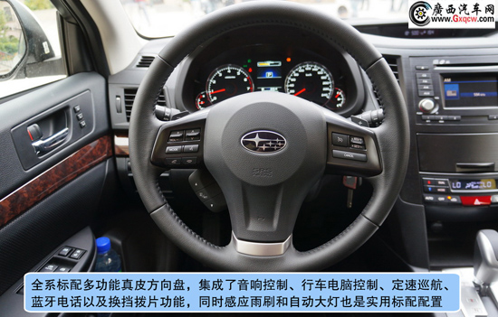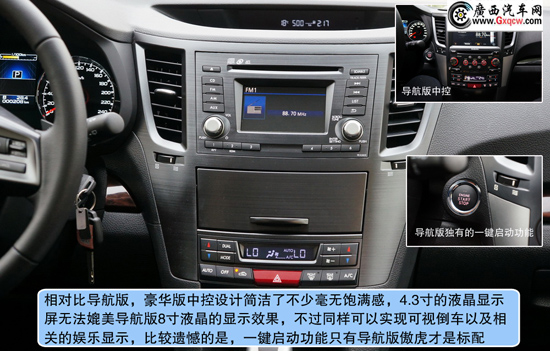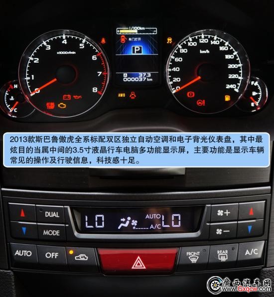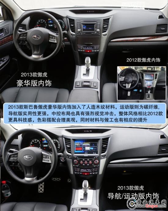 2013款斯巴魯傲虎2.5L豪華版——中控:全新2013款傲虎在內(nèi)飾上讓我們看到了不同之處,電子背光儀表盤/彩色液晶指示器/電子手剎功能,無時無刻不彰顯科技感,豪華版的木紋人造材料絲毫沒有讓人感到反感,相反隱約的透漏一絲尊貴,當(dāng)然,我們還可以選擇運(yùn)動版的碳纖維的裝飾;對比來看我們會發(fā)現(xiàn)售價31.48萬的導(dǎo)航版提供了智能鑰匙系統(tǒng)、更先進(jìn)的娛樂系統(tǒng)和更加飽滿豐富的中控布局,價格僅相差1萬5左右并不離譜,唯一遺憾的是全系并不提供全景天窗。