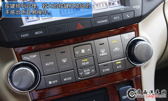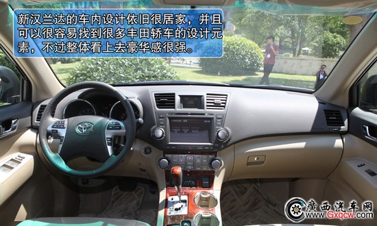 2012款豐田漢蘭達(dá)2.7L兩驅(qū)7座豪華版——中控:與健碩的外觀不同,漢蘭達(dá)的車內(nèi)設(shè)計(jì)依舊很居家,并且可以很容易找到很多豐田轎車的設(shè)計(jì)元素,不過整體看上去豪華感很強(qiáng)。與老款車型相比,變化同樣很小,較大尺寸的方向盤依舊為四輻式,只是多功能按鍵的位置發(fā)生了變化。自發(fā)光的儀表盤讀數(shù)很清晰,而紅色標(biāo)線又帶來了少許的運(yùn)動元,而中控按鍵排列合理,并沒有由此產(chǎn)生松散感,較大的按鍵及旋鈕的手感也很出色,非常易操作。