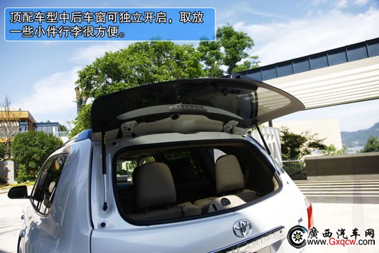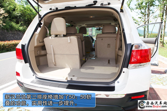 2012款豐田漢蘭達(dá)2.7L兩驅(qū)7座豪華版——后備箱:第三排座椅增加了50:50折疊的功能,讓后備箱實(shí)用性進(jìn)一步提升。這也是漢蘭達(dá)7座版的優(yōu)化之處,后窗獨(dú)立開啟功能,也是比較罕見實(shí)用的SUV功能。
