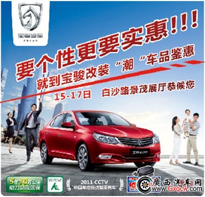 3月15-17日,白沙路景茂寶駿4S店開(kāi)展“寶駿汽車改裝潮車品鑒會(huì)”,新推出改裝車系,給客戶感受不一樣的2013寶駿個(gè)性車型。