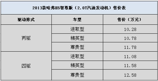 2013款哈弗H5智尊版2.0T汽油發(fā)動(dòng)機(jī)車型已于6月份正式上市!此次新車將提供兩驅(qū)、四驅(qū)在內(nèi)的6款車型,售價(jià)區(qū)間為10.28萬-12.58萬,目前廣西弘泰長城汽車店內(nèi)此款車型火熱預(yù)定中!