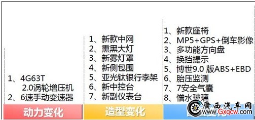配置方面,新款車型新增MP5+GPS+倒車影像、新款座椅、真皮多功能方向盤(定速巡航+藍(lán)牙+音響)、換檔提示、博世9.0 版ABS+EBD、胎壓監(jiān)測、7 安全氣囊、憎水玻璃等多種智能化高檔設(shè)備。