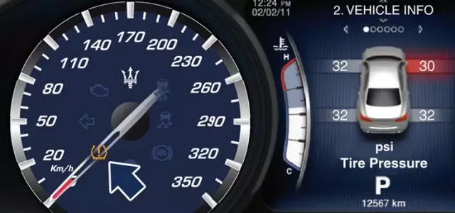 胎壓值過低警告燈胎壓低于低壓警告界限,胎壓監(jiān)控系統(tǒng)警告燈(圖左所示)亮起,并閃爍示意低壓的輪胎位置以及胎壓值(圖右所示)。這時應(yīng)盡快停車,給壓力過低的輪胎充氣至推薦值。