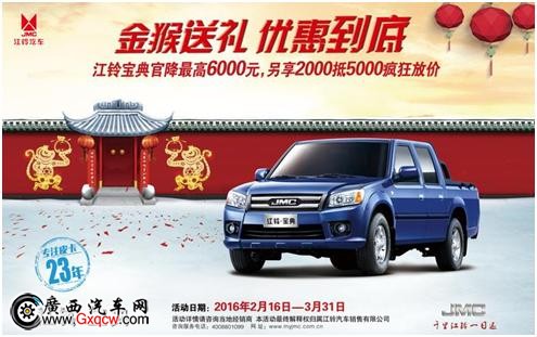 近日,小編走訪廣西江鈴安吉4S店了解到,即日起至3月31日到店購江鈴寶典皮卡即可享受預交2000元訂車款抵5000元購車款,購車特惠季,江鈴寶典與您同行,欲購車的廣大朋友速速到店搶購吧!咨詢熱線:0771-3119811.