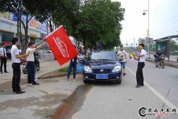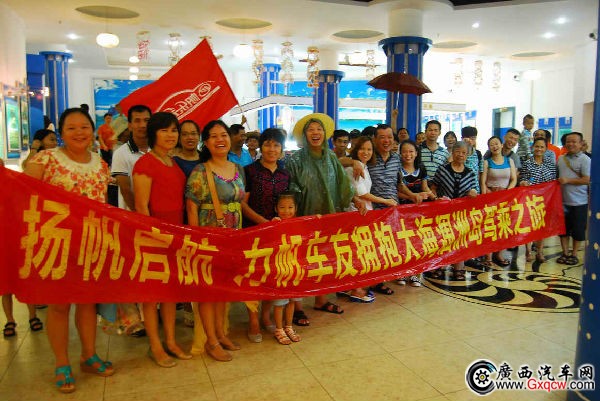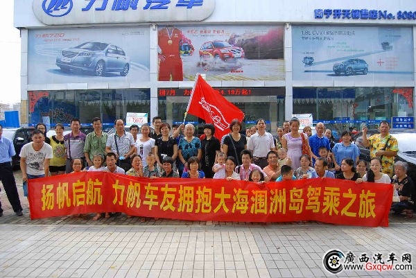 參與本次車友會(huì)活動(dòng)的力帆車系囊括了力帆620、320、520i、X60等車型, 清晨8點(diǎn)車友們陸續(xù)開(kāi)著愛(ài)車來(lái)到力帆南寧開(kāi)天安吉4S店門口處列隊(duì)集合,有單獨(dú)前往的車友、有帶著80歲母親共同前往的車友、還有帶著不足2歲孩子的車友,無(wú)論是獨(dú)行的還是攜帶家屬前往的,每位車友臉上都充滿著期待;工作人員為每位車友辦理簽到手續(xù)、車貼安裝,并發(fā)放了雨傘、礦泉水、活動(dòng)流程等物品。我們的啟動(dòng)儀式于9點(diǎn)開(kāi)始,拍完集體照后,所有人發(fā)動(dòng)車子,車隊(duì)在會(huì)旗飄搖下緩慢而有序的向北海潿洲島前進(jìn)了!下面上些PP讓大家共賞