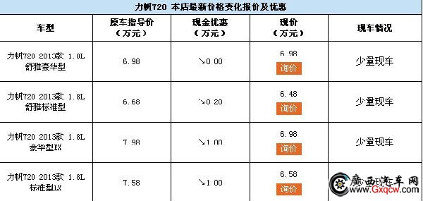 近日,開天力帆店內(nèi)力帆720現(xiàn)車銷售,顏色可選,目前購車部分車型可優(yōu)惠1萬元,感興趣的朋友可以到店咨詢購買,詳情見下表: