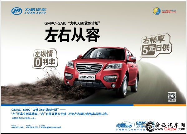 即日起,GMAC-SAIC為力帆X60推出一個(gè)左右從容的貸款計(jì)劃,即“左”可享0利率購(gòu)車!坝摇笔枪┲灰5元!不論左右都讓您購(gòu)車盡顯從容。