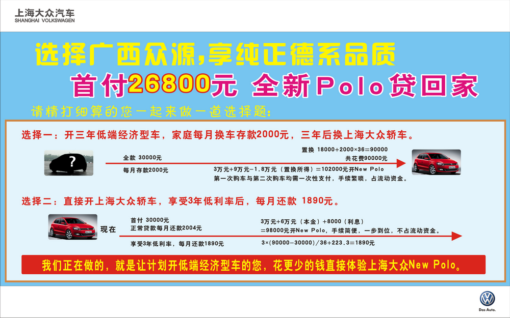 本次廣西眾源爽動夏日歡樂團購會,參與特惠活動的車型幾乎涉及上海大眾全系熱銷車型,本次活動除了推出驚喜優(yōu)惠促銷政策之外,還有多款車型的個人貸款方案供車友們選擇。9月30日前,新Polo,Polo新勁取貸款均可享受0利率,樂享Polo 零負擔!更有2年/3年低利率、半付半貸0利率等多項優(yōu)惠貼心活動。與常規(guī)貸款方案對比:首付和貸款金額相同,但從分12期來看,零利率貸款為車主1年節(jié)省了5008元的利息總額,可以說您這一年油費及其他費用都省下來了。我們現(xiàn)在做的,就是讓本來計劃購買低端經(jīng)濟型車的您,花更少的錢直接體驗上海大眾新Polo!五萬元開走Polo,不再是夢想。
