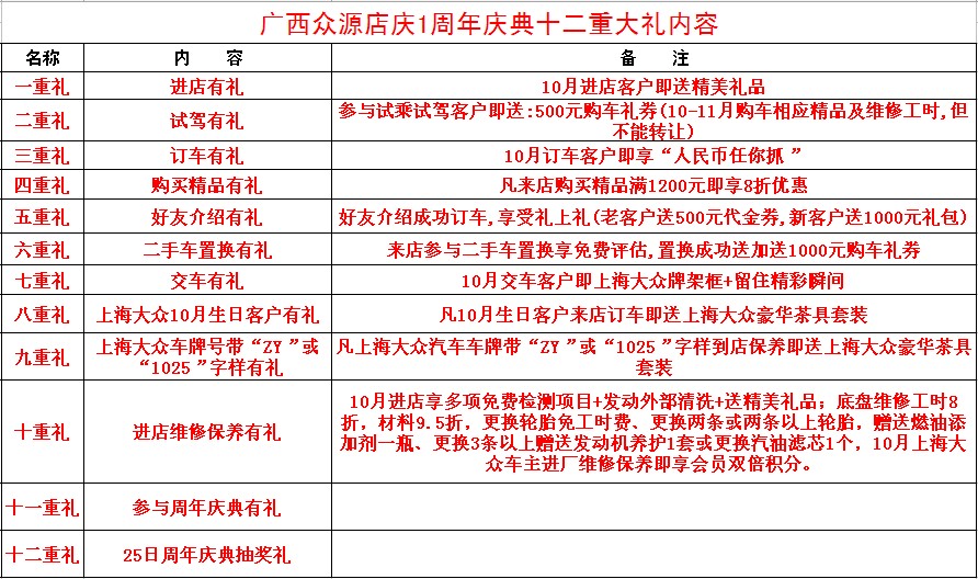 我們一步一個(gè)腳印走來,開業(yè)12個(gè)月一路有你同行,使我們不斷壯大。為答謝您12個(gè)月以來的一路相伴,即日起,新老客戶到上海大眾廣西眾源購車除享受以上店慶特惠外,再享店慶12重感恩大禮。