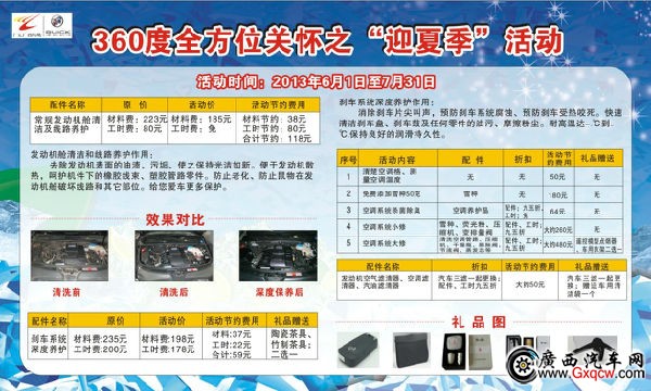 炎炎夏日,從心關(guān)懷,別克從2013年6月1日起到7月31日到店保養(yǎng)有優(yōu)惠:
