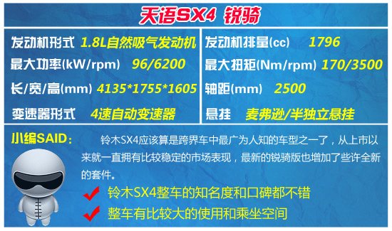 首先為大家推薦的這款,就是在國(guó)內(nèi)跨界車市場(chǎng)中享譽(yù)已久的長(zhǎng)安鈴木天語(yǔ)SX4,想必很多消費(fèi)者對(duì)于跨界車的概念,還是源于天語(yǔ)SX4的出現(xiàn)吧。繼去年初長(zhǎng)安鈴木推出了全新的天語(yǔ)尚悅?cè)龓,長(zhǎng)安鈴木在去年底的廣州車展(微博)上也適時(shí)的推出了新款天語(yǔ)SX4銳騎兩廂車型。新車對(duì)車輛的外觀、內(nèi)飾以及配置方面,均進(jìn)行了升級(jí)和調(diào)整,廠家指導(dǎo)價(jià)為10.98-13.48萬(wàn)元。