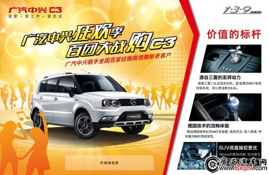 廣汽中興C3,是廣汽與中興合資公司生產(chǎn)的都市多功能SUV,楔形車身像極了路虎極光,硬朗時尚的外觀頗受廣大消費者的喜愛。搭載三菱4A91S發(fā)動機,1.5L的排量保證了其強勁的動力。標配雙安全氣囊及車身多根防撞鋼梁保證了駕乘人員的安全。超大的內(nèi)部空間滿足了消費者多種用途的需求。加上車輛配備的多種先進技術(shù)都讓其成為一部性價比相當高的多功能SUV!