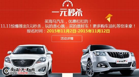 隨著“雙11”的不斷臨近,海馬汽車近日正式啟動了“雙11車主瘋狂季”促銷活動;顒悠陂g送油卡、送現(xiàn)金、1元購車等精彩環(huán)節(jié)將為您送上****的超級優(yōu)惠。這一切,只為您能盡快享受到幸福家轎——福美來,帶給您的高品質(zhì)生活享受。
