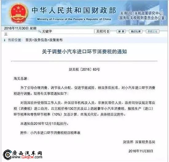 財政部11月30日發(fā)文表示,自2016年12月1日起執(zhí)行,對超豪華小汽車,在生產(chǎn)(進口)環(huán)節(jié)按現(xiàn)行稅率征收消費稅基礎(chǔ)上,在零售環(huán)節(jié)加征消費稅,稅率為10%。