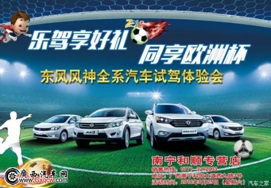 福利來了。!6月25-26日,南寧和順4S店舉辦“樂享好禮 同賞歐洲杯暨東風(fēng)風(fēng)神全系車型試駕體驗(yàn)會”,試不可擋!全系激情試駕火熱招募,夏季超低特價來襲,限時限量。進(jìn)店均有精美禮品,購車更有多重大禮,絕 對給您意想不到的驚喜!現(xiàn)場還有多種特惠金融方案供您選擇:0利息、大優(yōu)惠、高補(bǔ)貼,盡在南寧和順!精品、保險(xiǎn)、按揭、上牌、置換等一站式服務(wù)。心動不如行動!趕緊跟我們提前預(yù)約吧!網(wǎng)上預(yù)約報(bào)名購車還可贈送千元大禮包!您還等什么?地址:南寧市科園大道西九路3號 咨詢熱線:13481181120